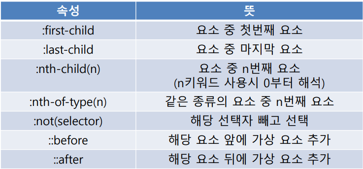 -> 가상 요소 선택자 (콜론이 두개, ::before, ::after) : HTML의 작성 없이 가상의 요소를 특정 요소 앞, 뒤에 추가. (HTML 구조 내에서는 표현되지 않음)